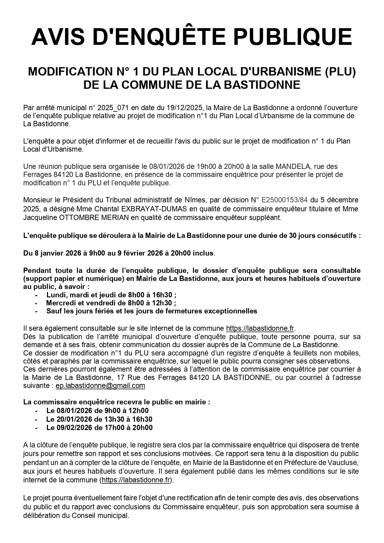- par email à : mairie@la-bastidonne.fr