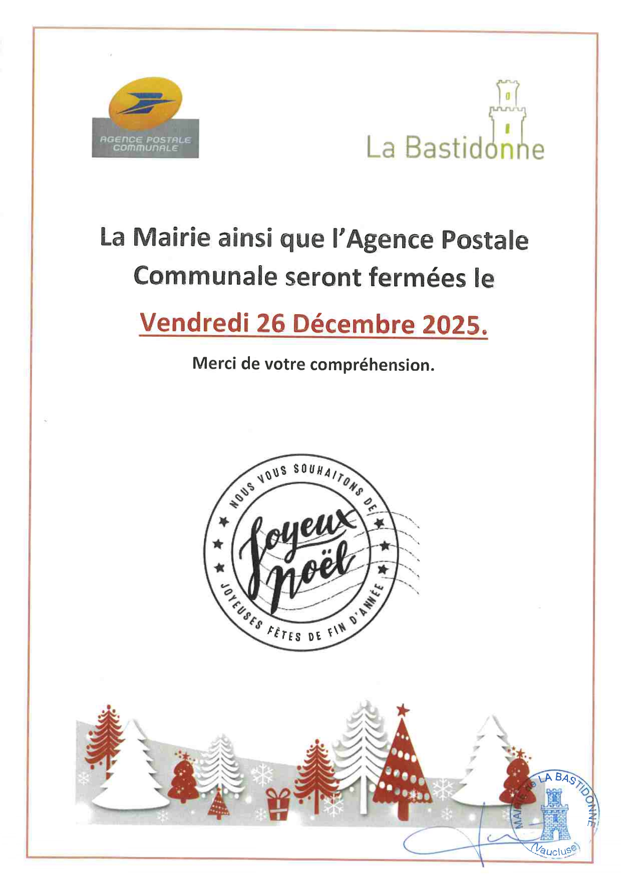L’agence Postale Communale de la Bastidonne est ouverte les matins du Lundi au Vendredi de 8h15 à 12h15.