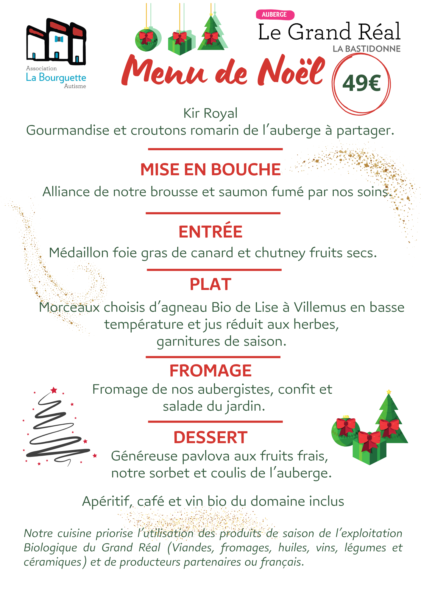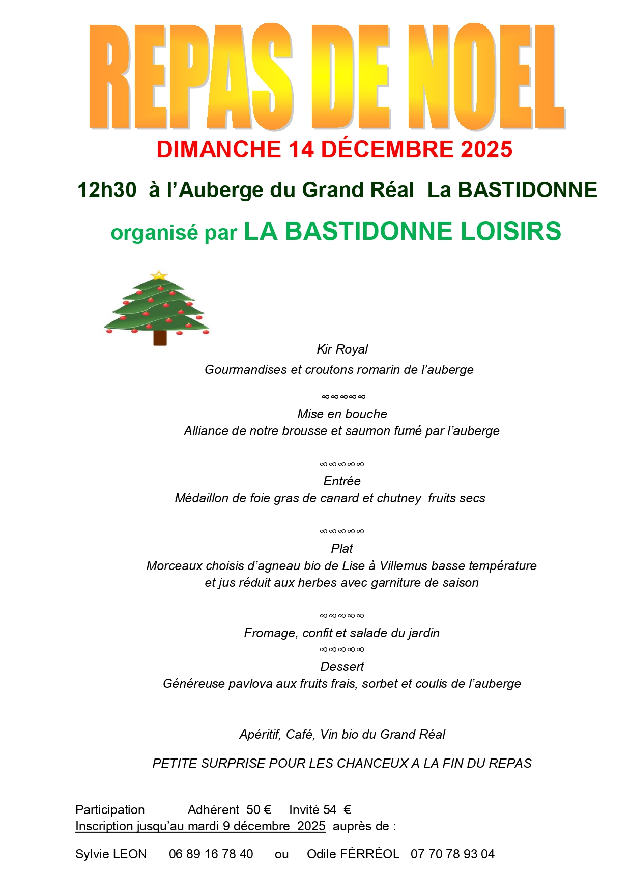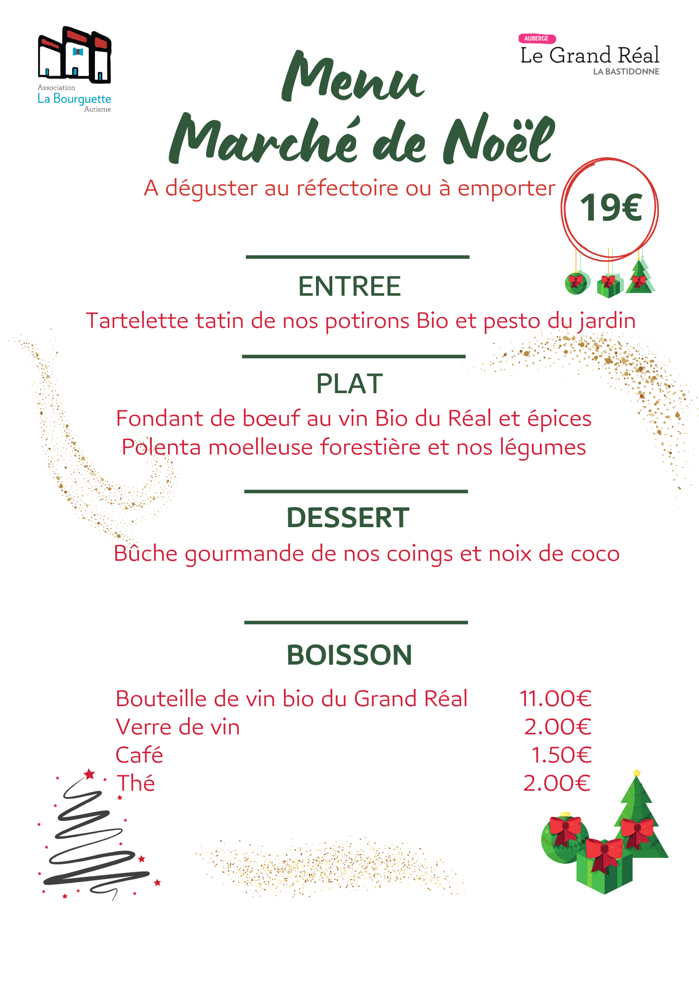 Ça y est nous sommes partis pour bientôt fêter Noël et comme le veut la tradition La Bastidonne Loisirs vous invite à partager le repas de Noël à 12h30 dimanche 14 décembre à l’Auberge du Grand Réal et à profiter à nouveau de leur Marché de Noël qui aura lieu le même jour. Le menu est unique (ouvrir la pièce jointe). Si une personne est allergique à un des produits, nous le faire savoir à l’avance.