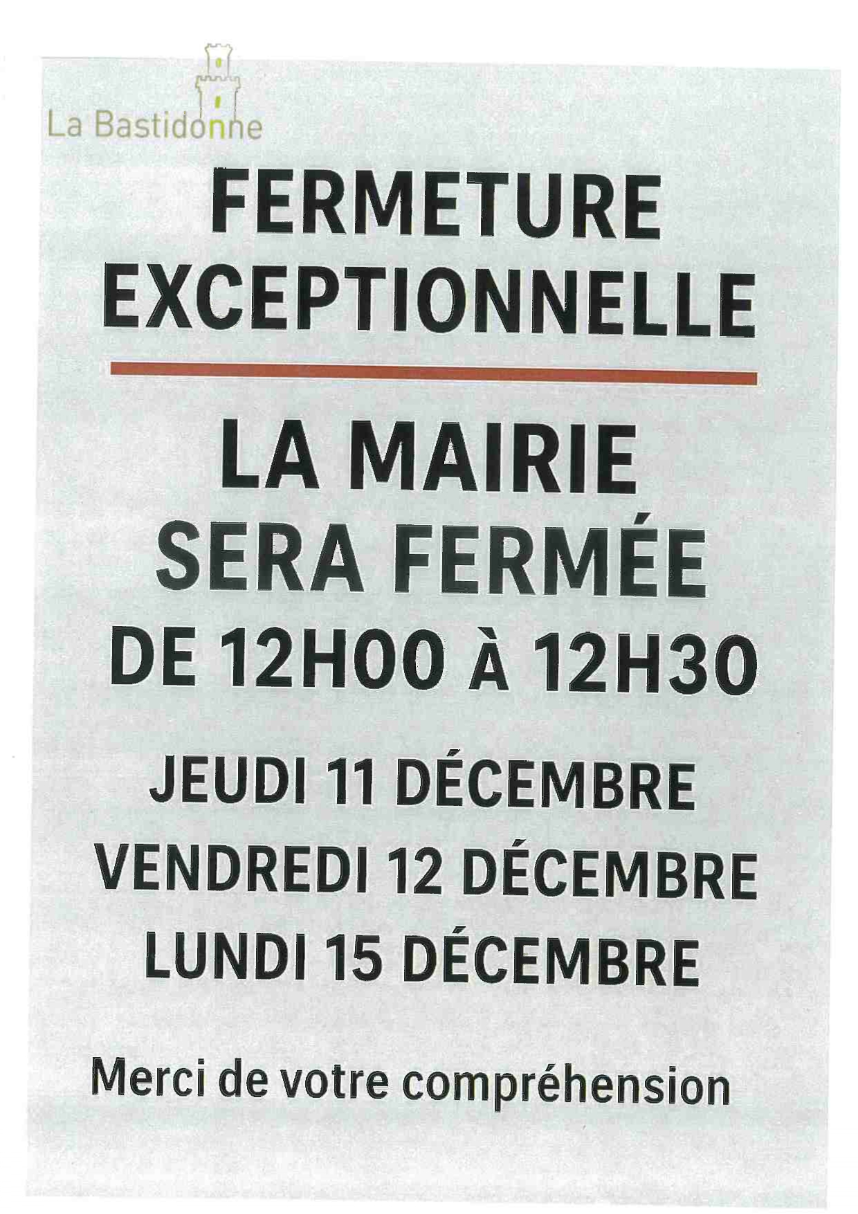 L’agence Postale Communale de la Bastidonne est ouverte les matins du Lundi au Vendredi de 8h15 à 12h15.